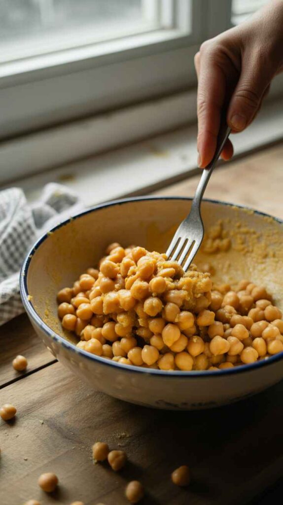 Mash them. Using a potato masher, fork, or the back of a wooden spoon, break down the chickpeas until you get a chunky-creamy mix. You want some whole pieces and some that are thoroughly smashed. This usually takes about two minutes. Don’t overdo it or you’ll have paste instead of texture.