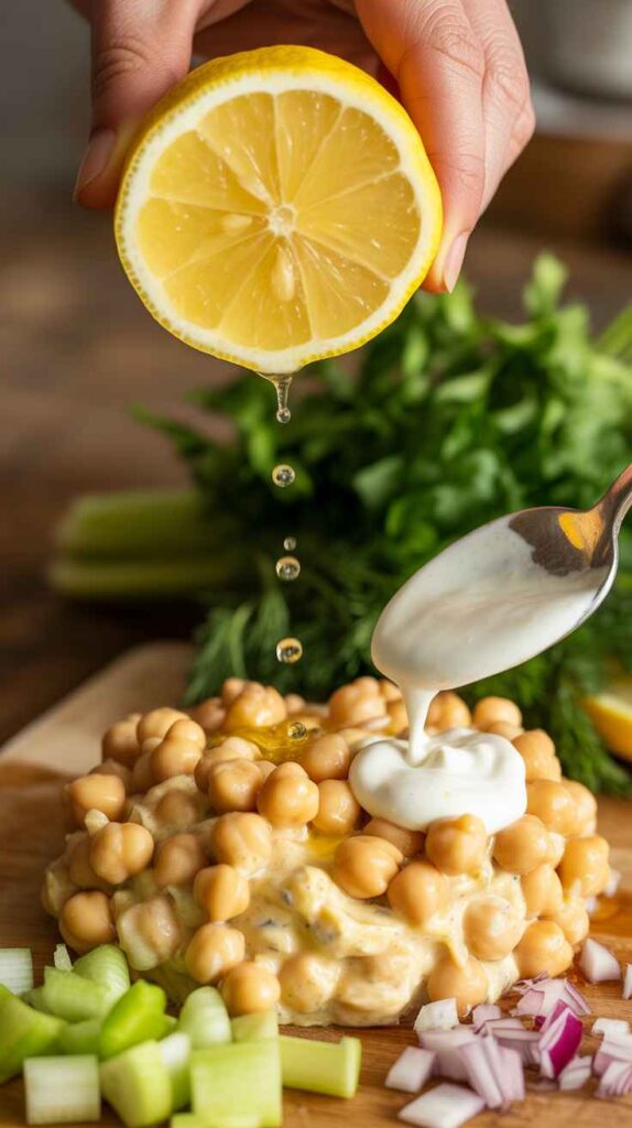 Buffalo-style: Skip the mayo-based approach entirely. Toss mashed chickpeas with a few tablespoons of hot sauce, blue cheese crumbles, and celery. Pack some ranch dressing on the side for dipping.