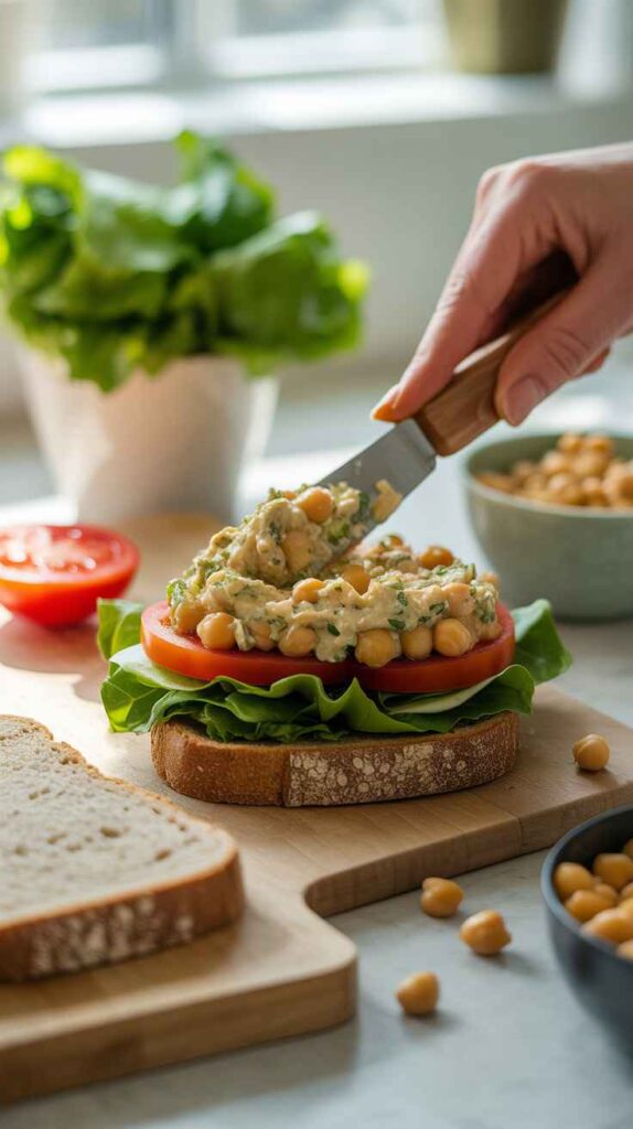 Chickpeas have a naturally creamy texture when mashed, which means you don’t need eggs or heavy mayo to create a satisfying filling. They’re packed with fiber and plant-based protein, so you’ll actually feel full for hours after eating this. The combination of herbs, lemon juice, and a creamy binder creates something that tastes deli-quality but costs way less.