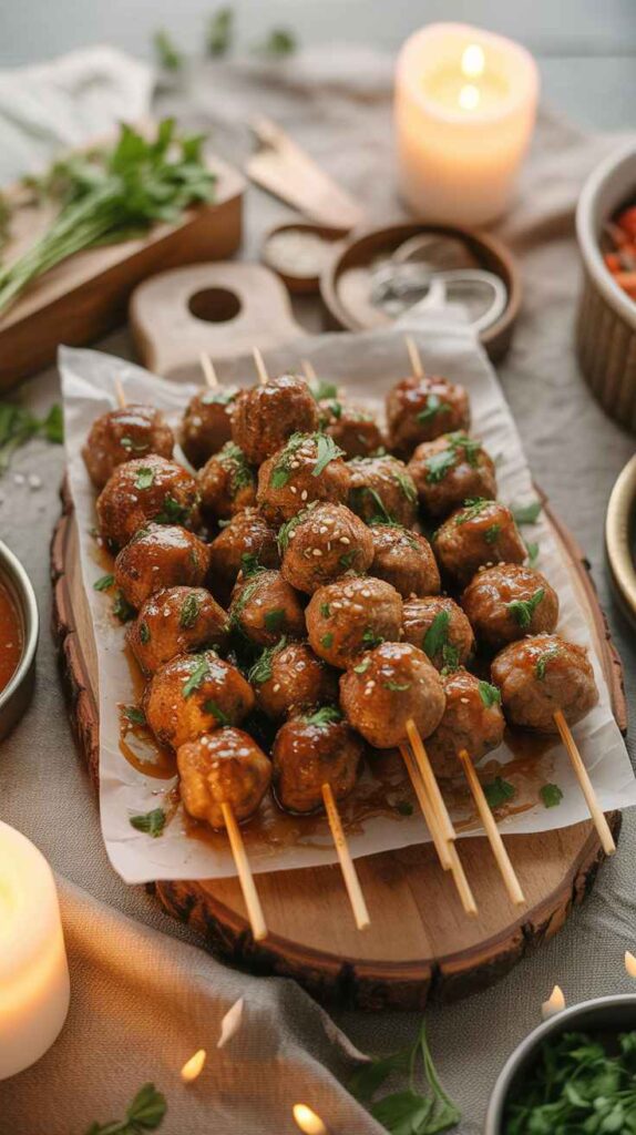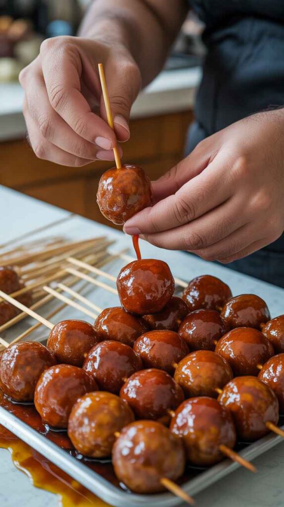 - Skewer them: Thread 3–4 glazed meatballs onto each skewer.Spoon over any extra sauce from the pan so they shine.