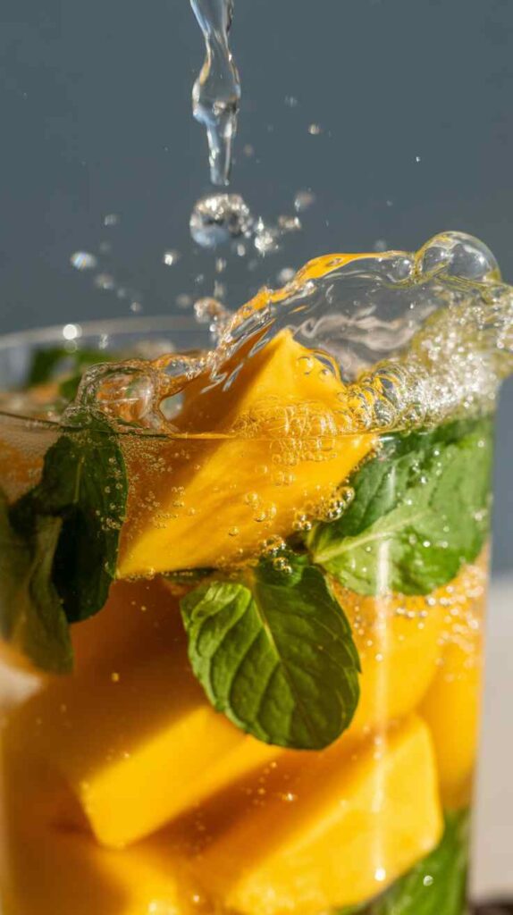 - Top with bubbles. Pour in chilled sparkling water or club soda to the top. Stir gently from the bottom to lift the mango and mint through the drink.