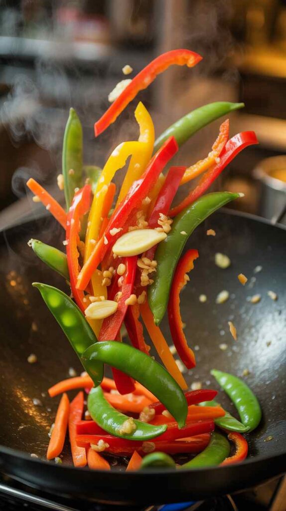 - Stir-fry the veggies.</-strong> Add another splash of oil if needed.Add garlic, ginger, and the white parts of the green onions. Cook 30 seconds until fragrant. Add vegetables and stir-fry 2–3 minutes until crisp-tender.