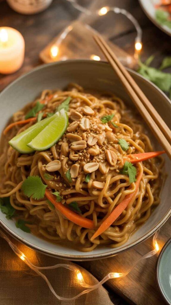 Silky noodles tossed in a creamy, nutty peanut sauce with crisp vegetables