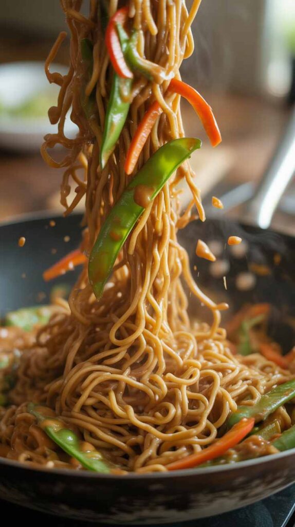 - Add noodles: Add the cooked noodles and toss well so every strand is sauced. If the sauce tightens, splash in 2–3 tablespoons water to loosen.