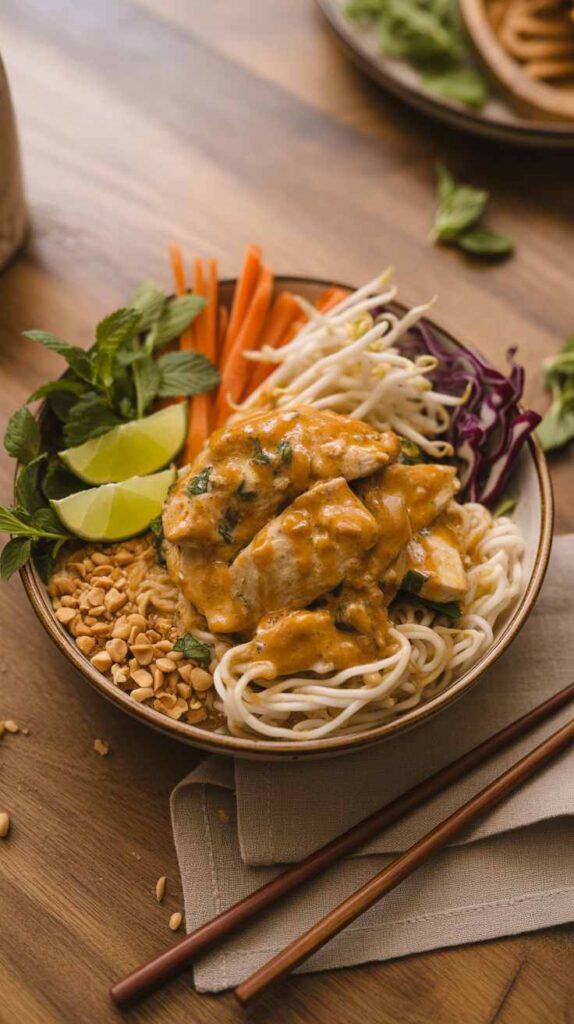 Creamy peanut noodles with tender chicken and crisp vegetables