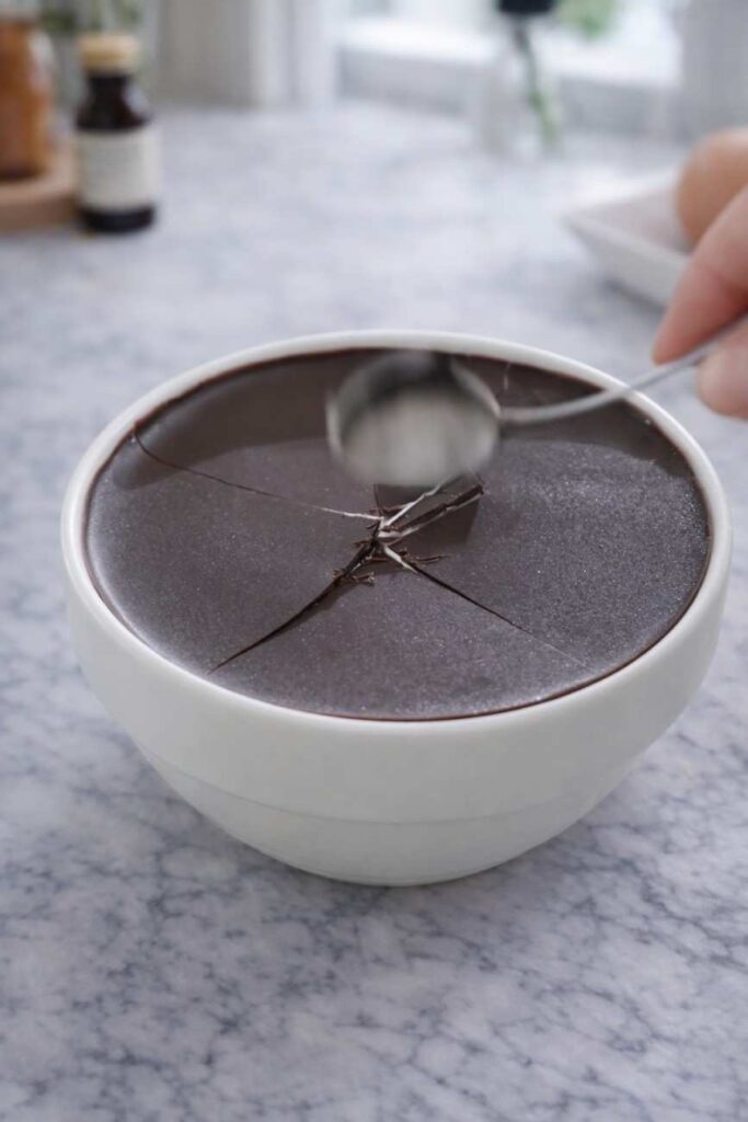 The original notes mention, “I’ve been waiting for this time.” There is a ritual to eating this dessert. Once it has hardened in the refrigerator, take it out.
