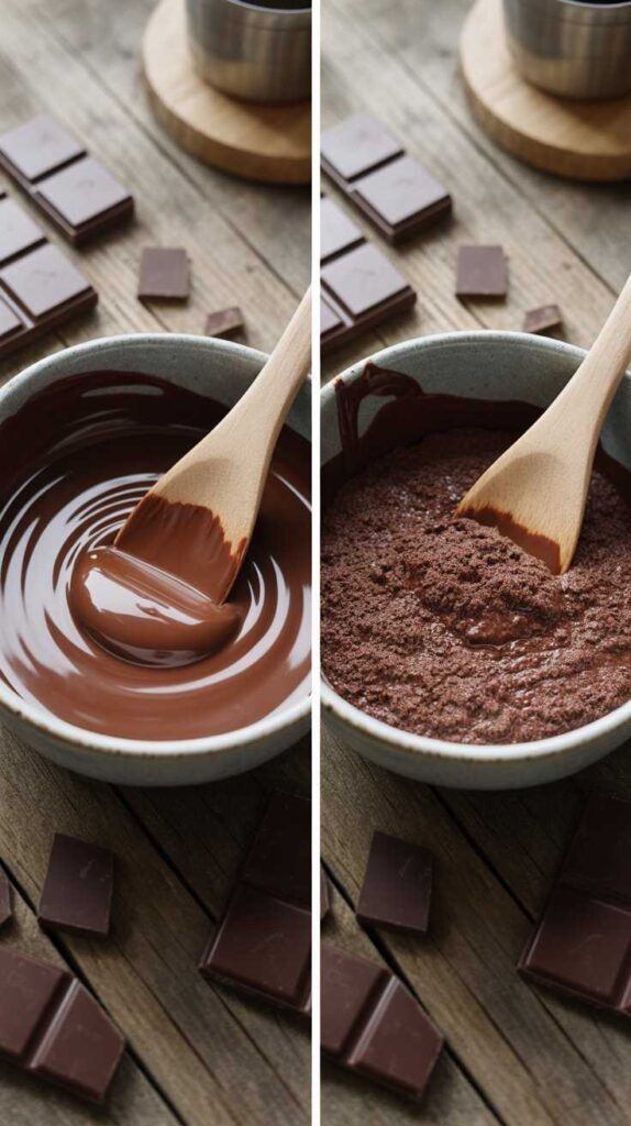 Crack room temperature egg into mashed banana. Whisk vigorously for 1 minute until frothy and uniform. Room temp = better emulsion, won’t shock melted chocolate.