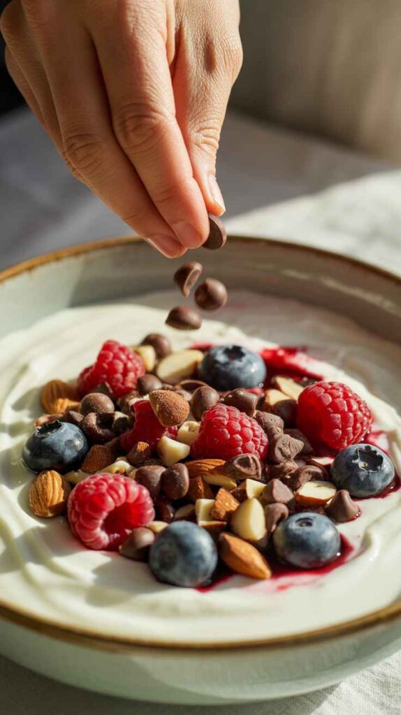 - Chocolate Berry: Mix 1 tablespoon cocoa powder into the yogurt and sweeten a touch more.Top with blackberries and a dark chocolate drizzle.