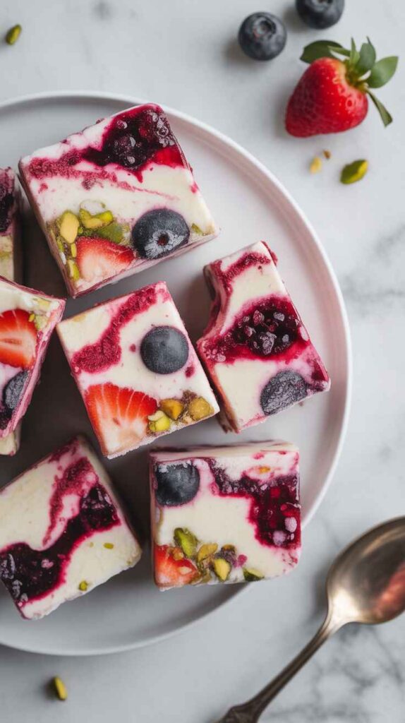 You spread, top, and freeze. It’s also endlessly flexible—use whatever berries you have, swap in nuts for crunch, or drizzle a little chocolate if you’re feeling fun.