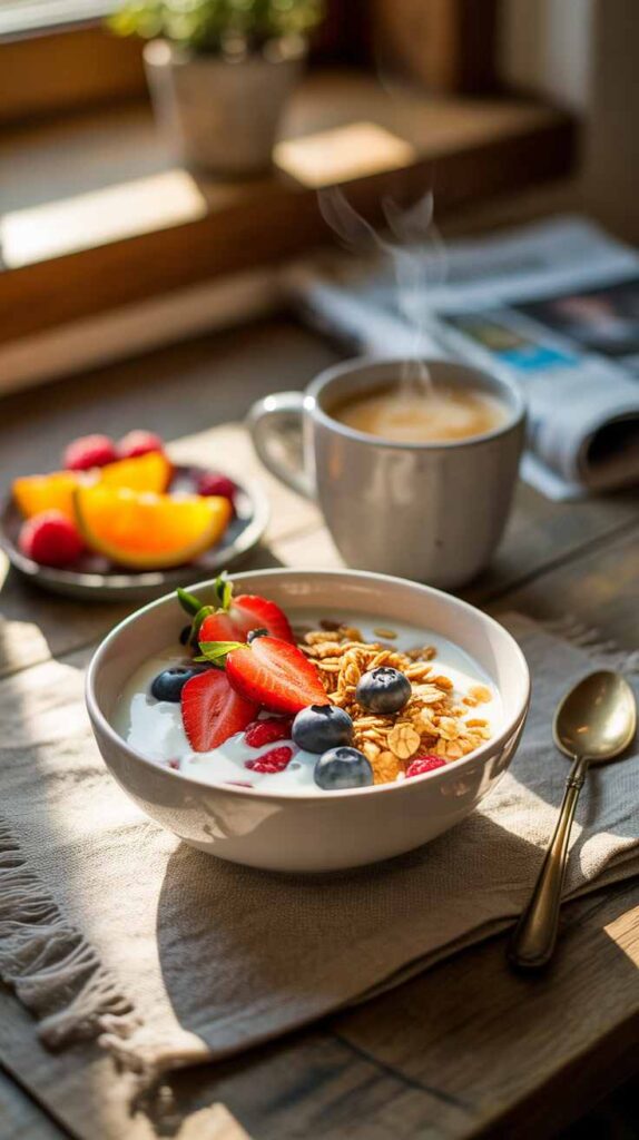 This is the kind of breakfast you can make when you’re still half-asleep and hungry. It’s creamy Greek yogurt, crunchy granola, a drizzle of golden honey, and a handful of fresh fruit—ready in five minutes flat. No stove, no baking, no fuss.