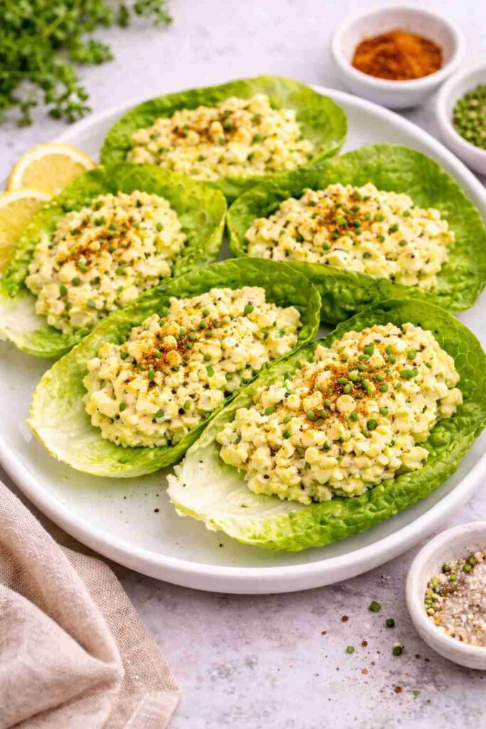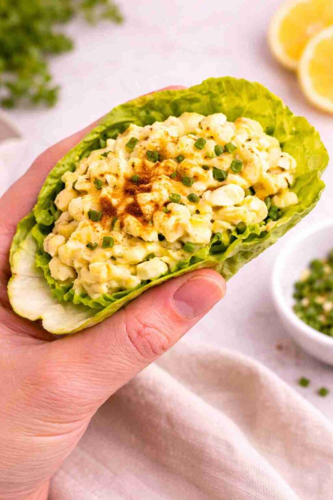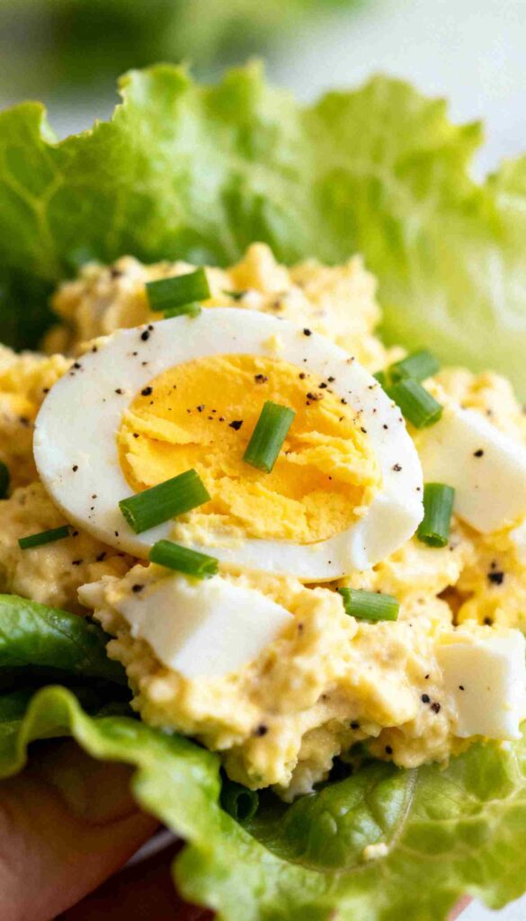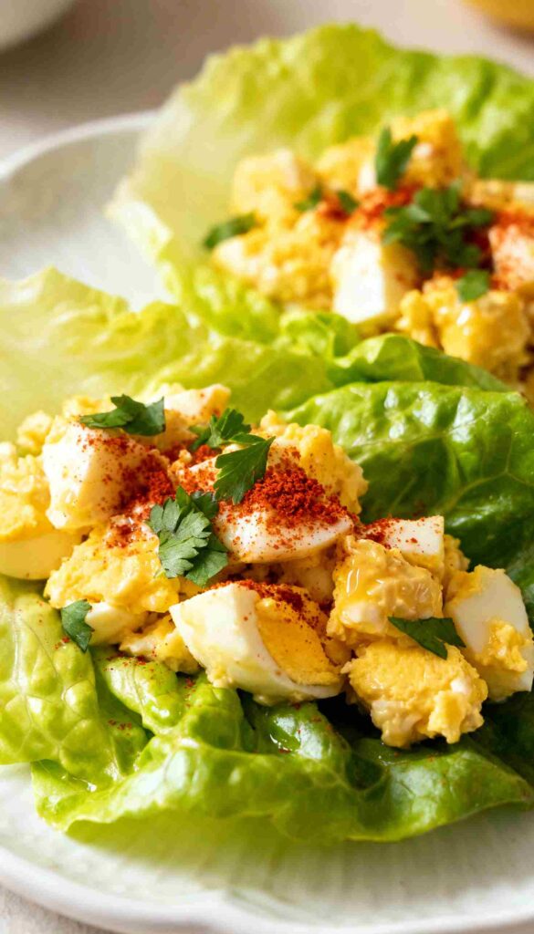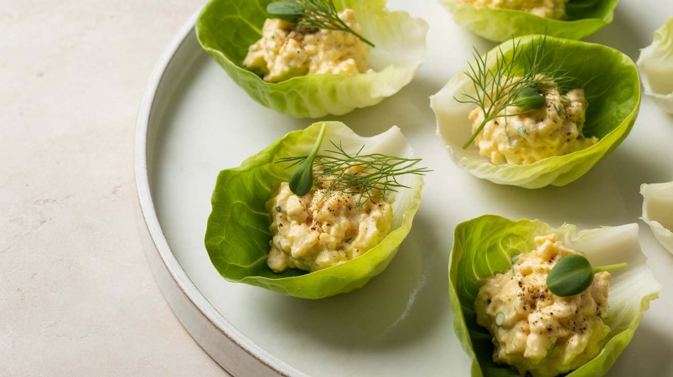 Creamy egg salad wrapped in crisp lettuce for a low-carb, high-protein bite