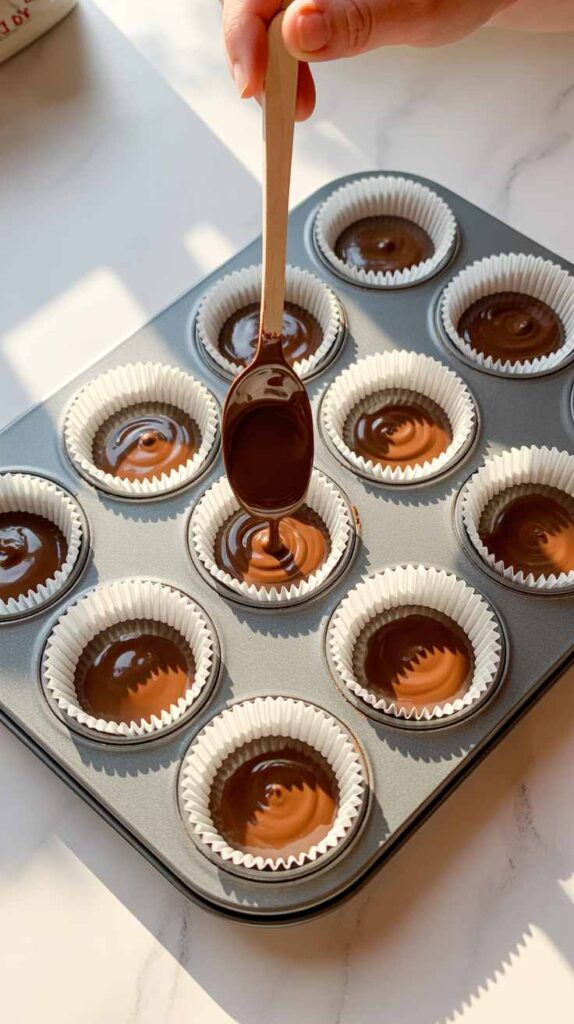 Add the first chocolate layer. Spoon one tablespoon of melted chocolate into each muffin liner. Use the back of your spoon to spread it evenly, creating a thin, even layer across the bottom. This base layer is crucial because it holds your peanut butter filling in place. Freeze for five minutes while you prepare the next step.