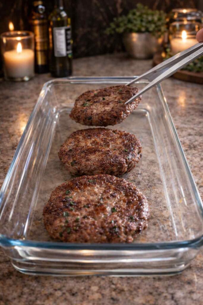 Lightly oil your palms with a small amount of vegetable oil. Divide the meatball mixture into 6 equal portions — they should be generously sized, more like large patties than small cocktail-sized balls. Roll each portion between your palms into a smooth, round ball, then flatten very slightly into a thick round shape. This increases the surface area for browning and ensures they sit stably in the baking dish.