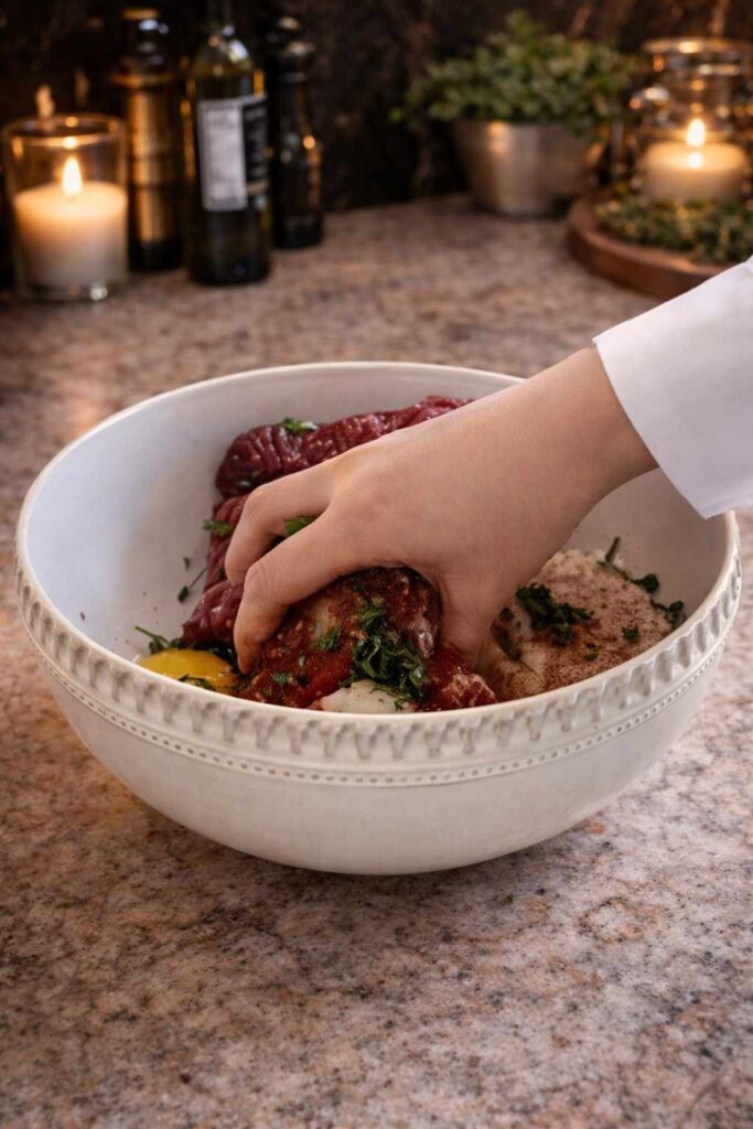 Knead everything together firmly and thoroughly with your hands for 2 to 3 minutes until the mixture is completely uniform and holds together well when pressed. The breadcrumbs will absorb the moisture from the onion and egg, and the mixture should feel cohesive and slightly tacky without being sticky. Cover and set aside for 5 minutes to allow the breadcrumbs to hydrate fully.