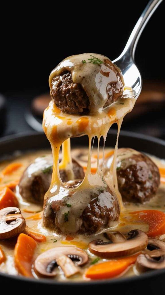 Baked Beef Meatballs with Creamy Mushroom Sauce is Turkish comfort cooking at its most generous and most satisfying. The juicy, spiced köfte, the silky vegetable cream sauce, and that golden, melted cheese topping come together into a dish that is hearty, beautiful, and deeply comforting all at once. It is the kind of recipe that rewards the care you put into each component — the properly seared meatballs, the patiently built sauce, the generous hand with the cheese — with a result that feels genuinely special every single time it comes out of the oven. Make it for your family, your guests, or simply for yourself on an evening when you want something truly satisfying on the table. It will not disappoint.