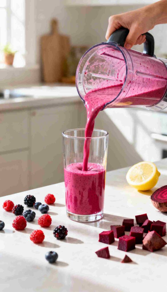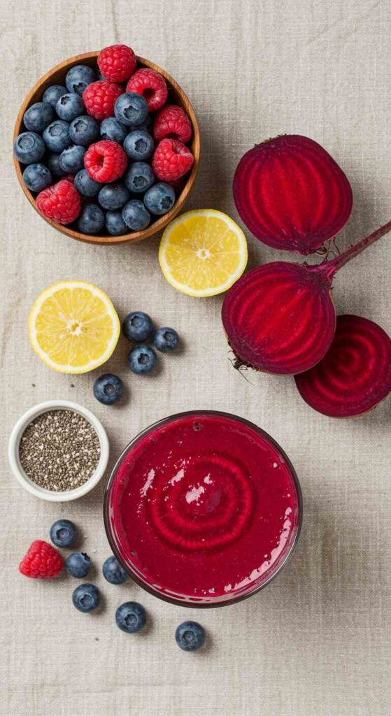 This smoothie balances flavors beautifully. The sweetness from berries and banana softens beetroot’s earthiness, while a splash of citrus brightens everything.