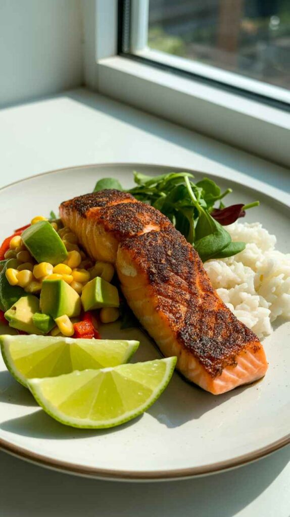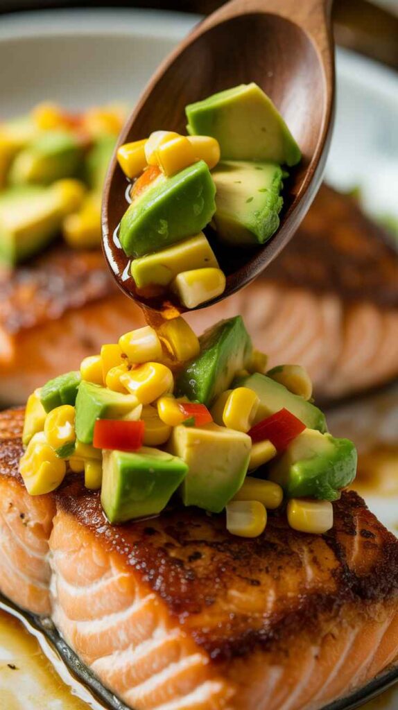 This is the kind of weeknight dinner that makes you feel like you really have it together. You get spicy, crispy salmon on the outside, perfectly tender inside, and a cool, juicy avocado corn salsa that balances every bite. It’s quick, bright, and full of texture—no fancy techniques, no long marinating, no fuss.