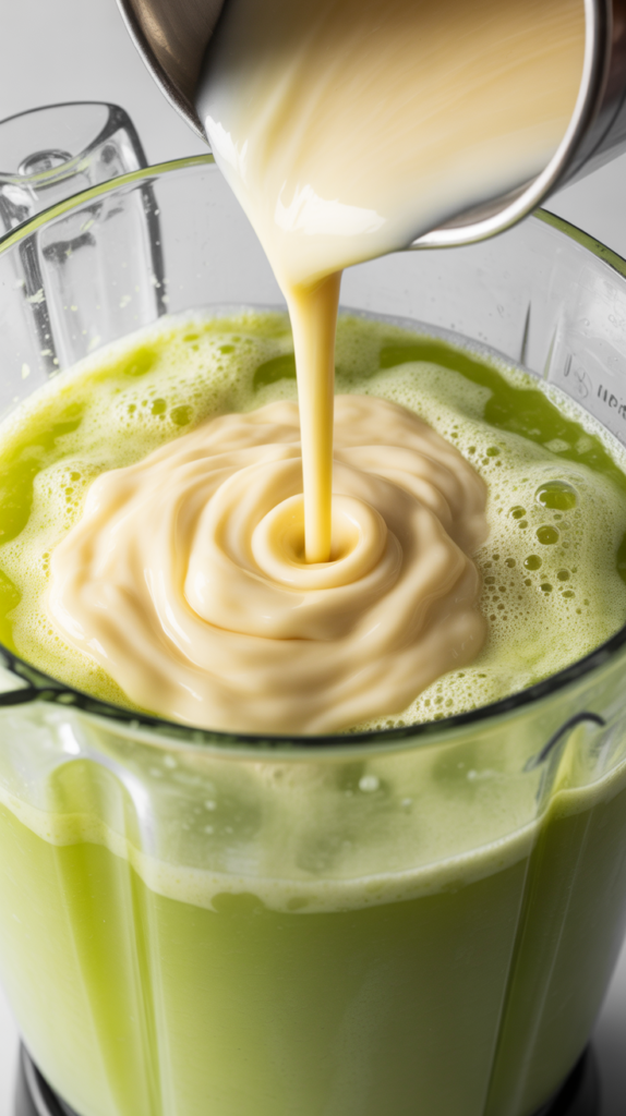 Second blend. Pour the strained lime water back into the blender. Add 1 cup of sweetened condensed milk and a splash more chilled water. Blend for just a few seconds until the mixture turns creamy and slightly frothy on top.