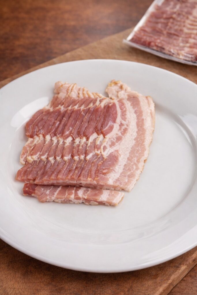 Remove the bacon from the package and cut every strip in half crosswise, producing two shorter half-strips from each full strip. This step is not merely a size adjustment — it is a technical requirement for the recipe to work correctly. A full-length bacon strip wrapped around a cocktail smoky will overlap itself multiple times, creating thick layers of bacon that cannot render and crisp in the 12-minute cook window. The outer layers will begin to caramelize and harden while the inner layers remain raw, undercooked, and unpleasantly chewy. A half-strip, by contrast, wraps around the smoky in approximately 1 to 1.5 rotations — the ideal coverage that allows every layer of bacon to be fully exposed to the circulating heat while still completely encasing the sausage. Cold bacon is significantly easier to handle, cut, and wrap than room-temperature bacon, so work directly from the refrigerator.