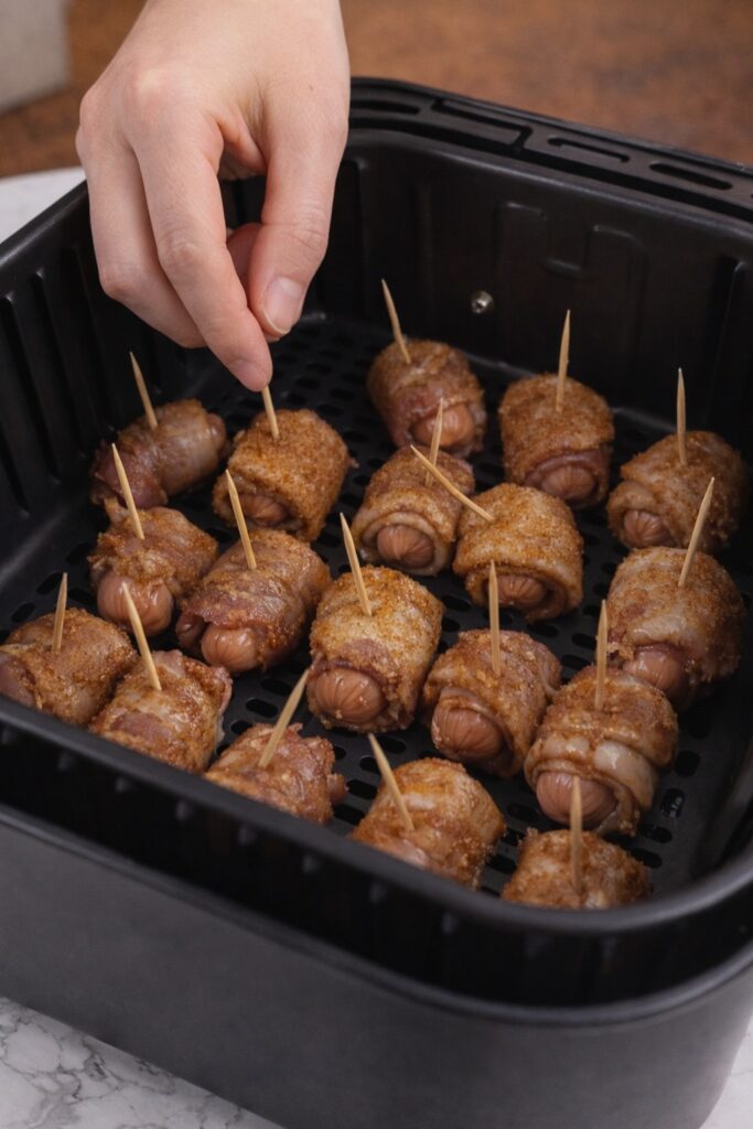 Standard toothpicks (approximately 2.5 inches long, 1.5–2mm diameter) provide sufficient penetration depth to pass through both the top bacon layer and the cocktail smoky and emerge through the opposite bacon layer — locking all three elements (top bacon, smoky, bottom bacon) into a fixed relationship that survives the contracting forces of the cooking bacon. Cocktail skewers (longer, typically 3.5–4 inches) provide more mechanical leverage but introduce the risk of protruding ends catching on the air fryer basket during the cook, potentially displacing smokies from their arranged position. Standard toothpicks are the correct choice for air fryer preparation specifically; cocktail skewers are more appropriate for oven-baked versions where positional disturbance is less likely.