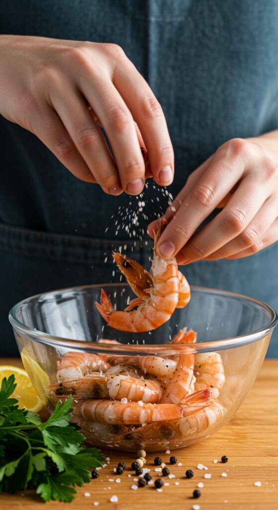 Season the prawns. Place the cleaned, deveined prawns in a bowl with salt and black pepper. Toss gently and let them rest for about 15 minutes. This brief rest lets the seasoning penetrate and draws out surface moisture, which helps them sear instead of steam.