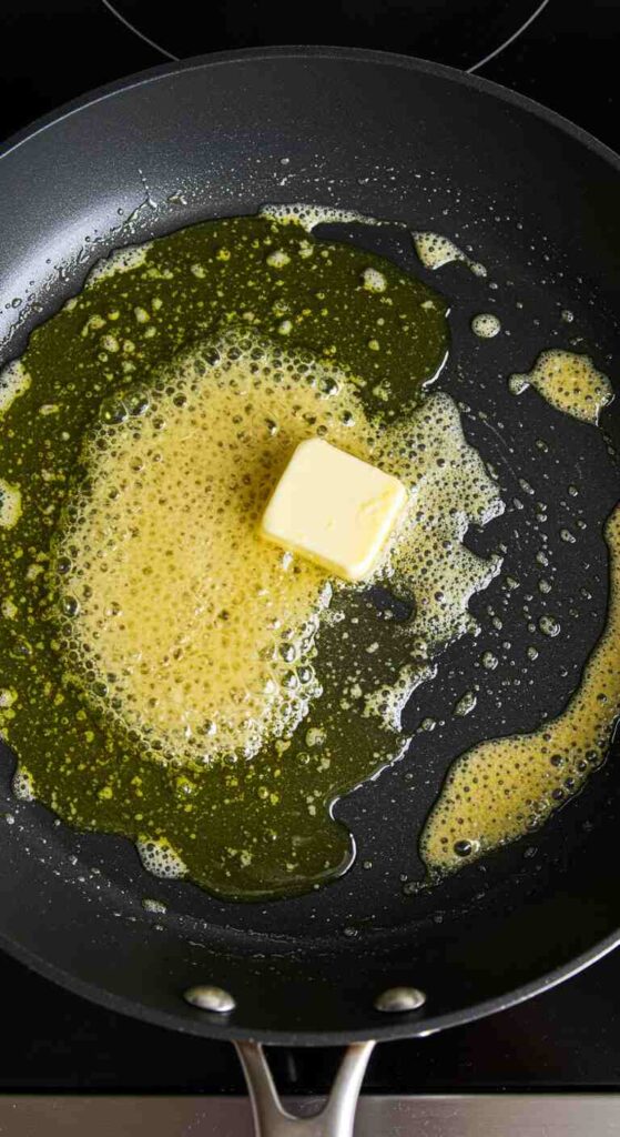 Heat the pan. Place a large skillet over medium heat and add the olive oil and butter. Let the butter melt and start to foam. The oil keeps the butter from burning while giving you that rich, golden flavor.