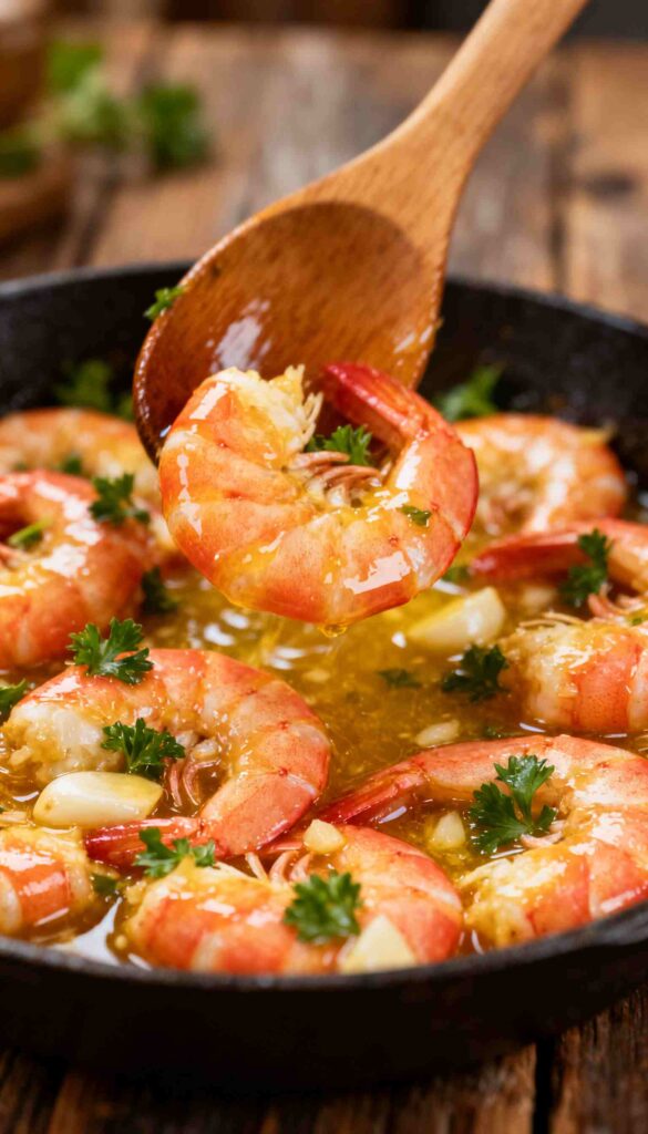 Serve hot. Plate immediately and spoon any remaining garlic butter from the pan over the top. This dish waits for no one — eat it straight from the skillet while the butter is glossy and the prawns are at their juiciest.