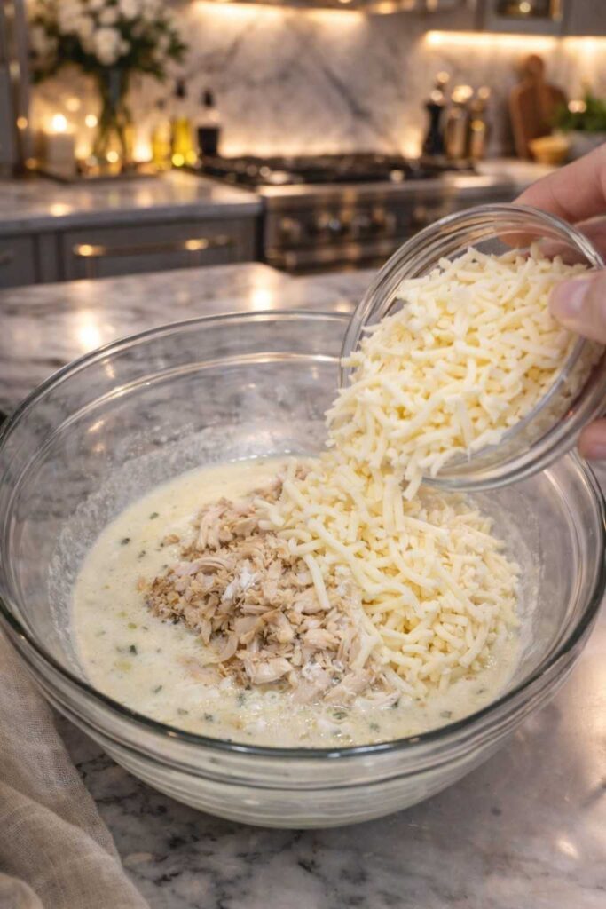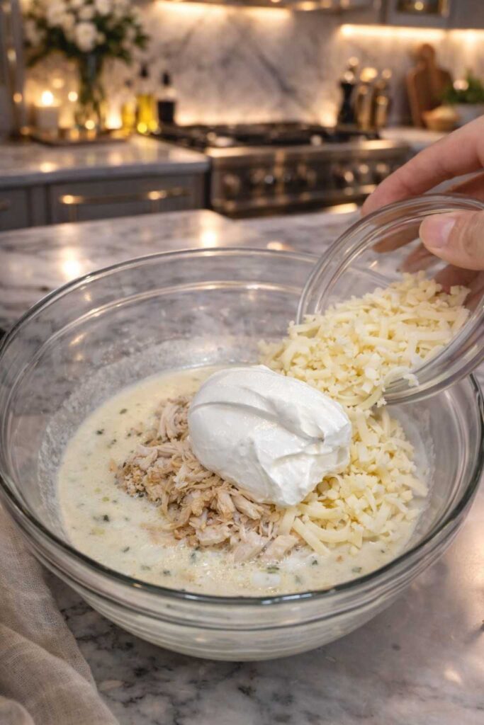 Fold the cooked chicken into the sauce mixture. If you’re using broccoli or spinach, add it at this stage and fold that in too. Add 1 cup of the shredded cheese and stir until everything is evenly combined. The cheese will begin to meld into the warm sauce, adding another layer of creaminess to the filling.