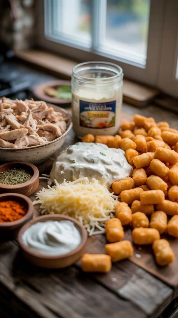 First, it uses simple, accessible ingredients. A jar of Alfredo sauce, some cooked chicken, a bag of frozen tater tots, and a handful of pantry staples — that’s essentially the whole shopping list. Nothing obscure, nothing expensive, and nothing that requires a speciality store.