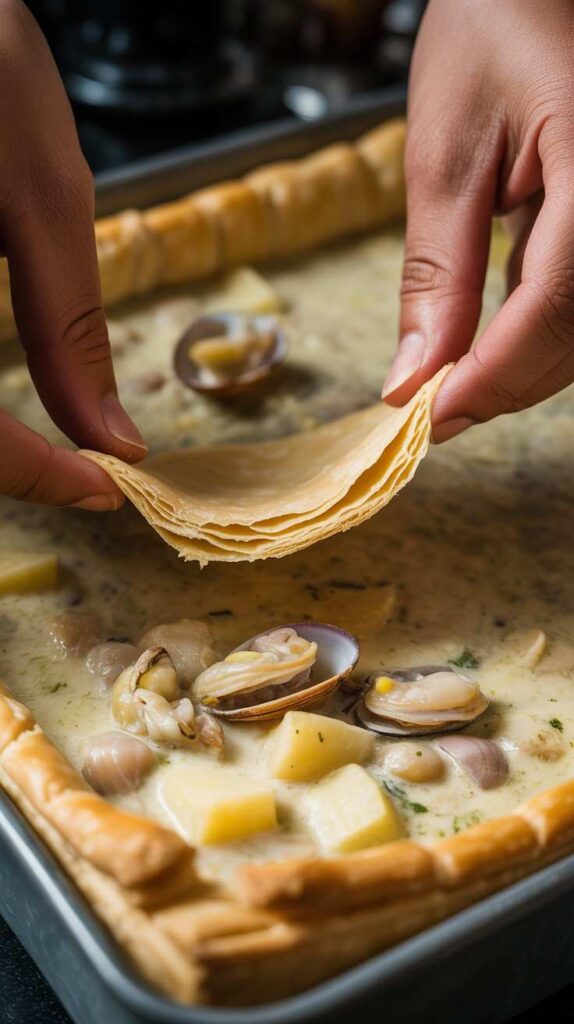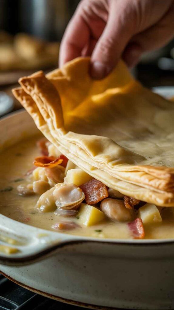 Can I freeze clam chowder pot pie? You can freeze it before baking. Assemble the pie completely, wrap it tightly in plastic wrap followed by foil, and freeze for up to 2 months. Bake from frozen at 375°F (190°C) for 55 to 65 minutes, covering loosely with foil for the first 30 minutes to prevent over-browning.