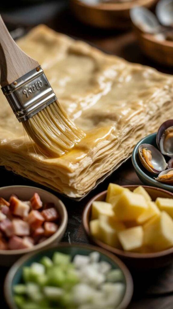 Preheat your oven to 400°F (200°C). Transfer the cooled clam filling into a 9-inch deep-dish pie dish or divide it evenly among four individual ramekins for an elegant presentation. Make sure the filling comes up to about ¾ of the way — not all the way to the rim, as you need room for the crust to seal.