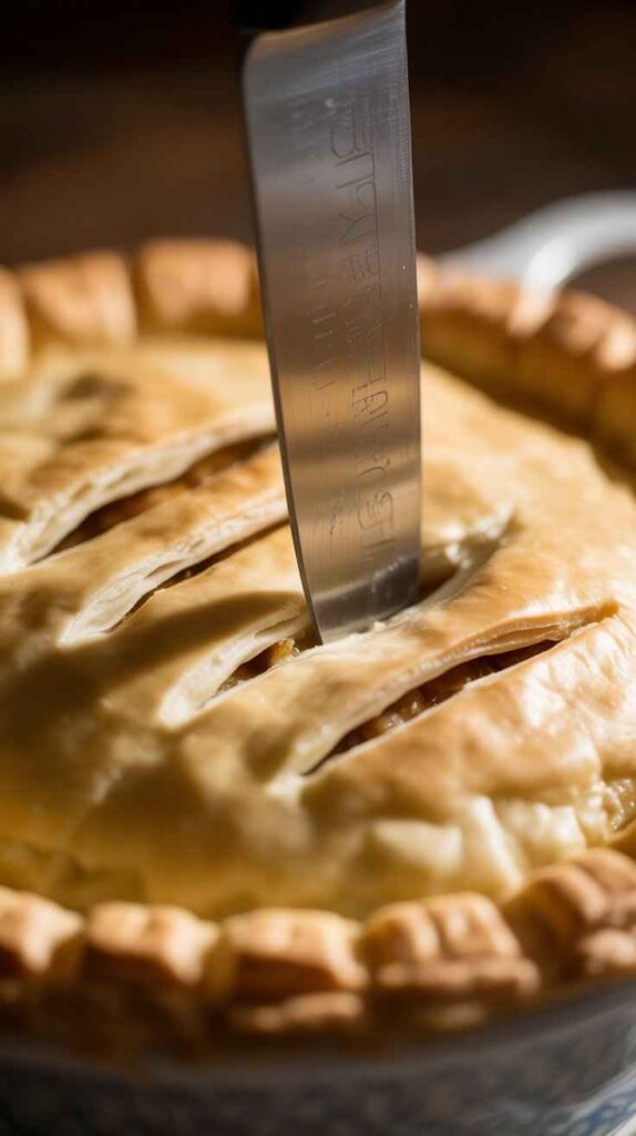 Brush the entire surface of the pastry generously with the beaten egg. This gives the crust its gorgeous, deep golden color as it bakes. Using a sharp knife, cut 3 to 4 small slits in the center of the pastry to allow steam to escape. Without these vents, the steam trapped inside can make the crust puff unevenly or become soggy.