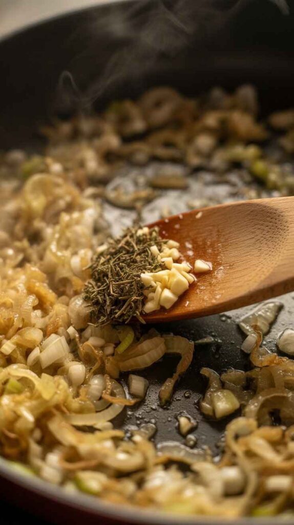 To the same pot with the reserved bacon drippings, add the diced onion and celery. Cook over medium heat, stirring frequently, for about 4 to 5 minutes until softened and translucent. Add the minced garlic and dried thyme, and cook for another 30 seconds until fragrant.