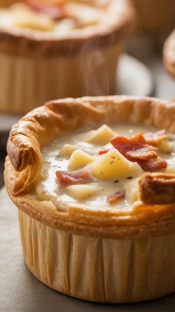This clam chowder pot pie recipe is great for a dinner party and also great for a quiet weeknight at home. It combines two classic American comfort foods into one beautiful, filling dish. The filling is thick and rich, with chopped clams, crispy bacon, soft potatoes, and a cream-based sauce that has been thickened just right. The golden brown puff pastry lid makes a strong contrast with the creamy, savory filling underneath.