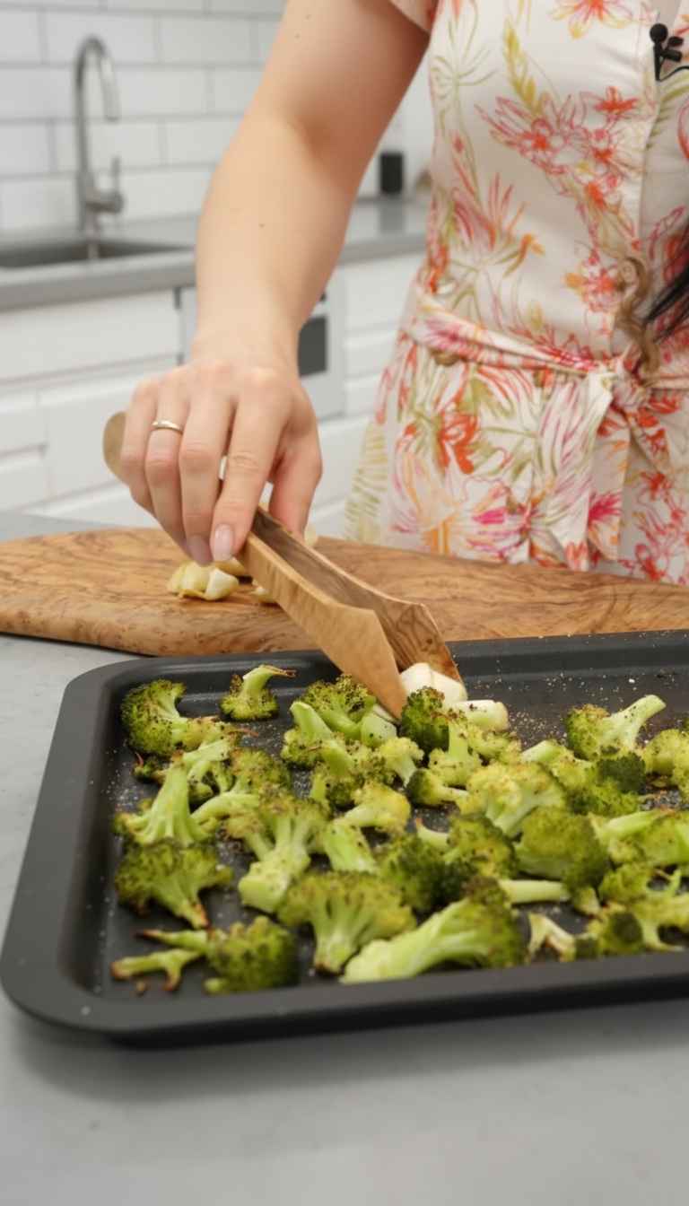 - Roast for exactly 20 minutes until the broccoli is tender with slightly caramelized edges and the garlic is soft and sweet
