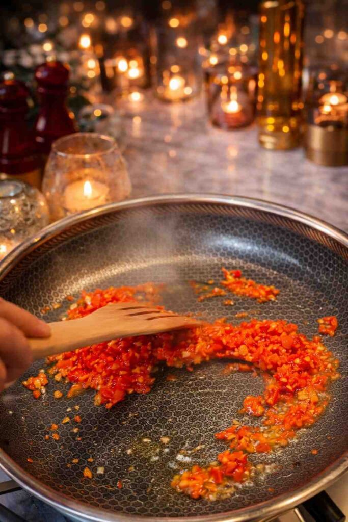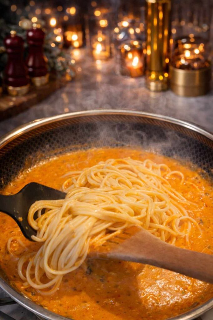 Taste the sauce at this stage and adjust the seasoning. More chilli flakes for heat, more salt to lift the flavours, more black pepper for depth — make it yours before the pasta goes in.