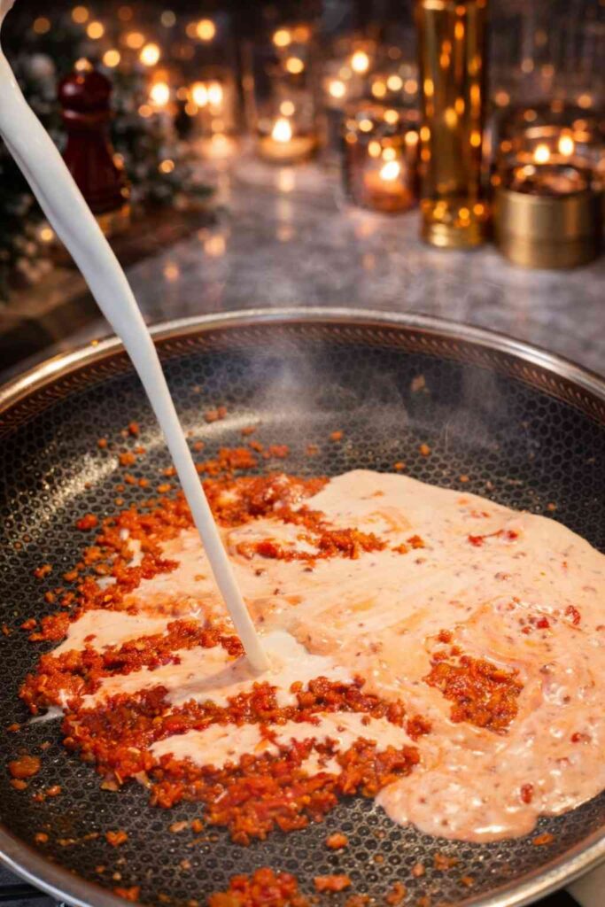 Pour the heavy cream into the pan, stirring well as it goes in to deglaze the base and lift all the flavourful bits into the sauce. Season with salt, black pepper, and chilli flakes to your preferred heat level. Stir to combine and let the sauce simmer gently over medium heat for 2 to 3 minutes, stirring occasionally. The cream will reduce slightly and thicken into a smooth, lightly spiced, beautifully coloured sauce — pale orange from the Cajun seasoning and tomato paste, glossy from the cream, and deeply aromatic.