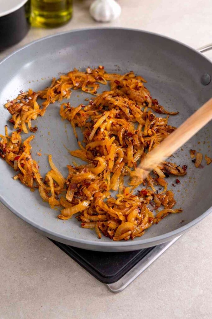 1. Flavor the Base: Heat 2 tbsp oil in a pan. Sauté sliced onions until they reach a deep golden brown. Stir in the chili flakes for 30 seconds to release their oils, then remove from heat.