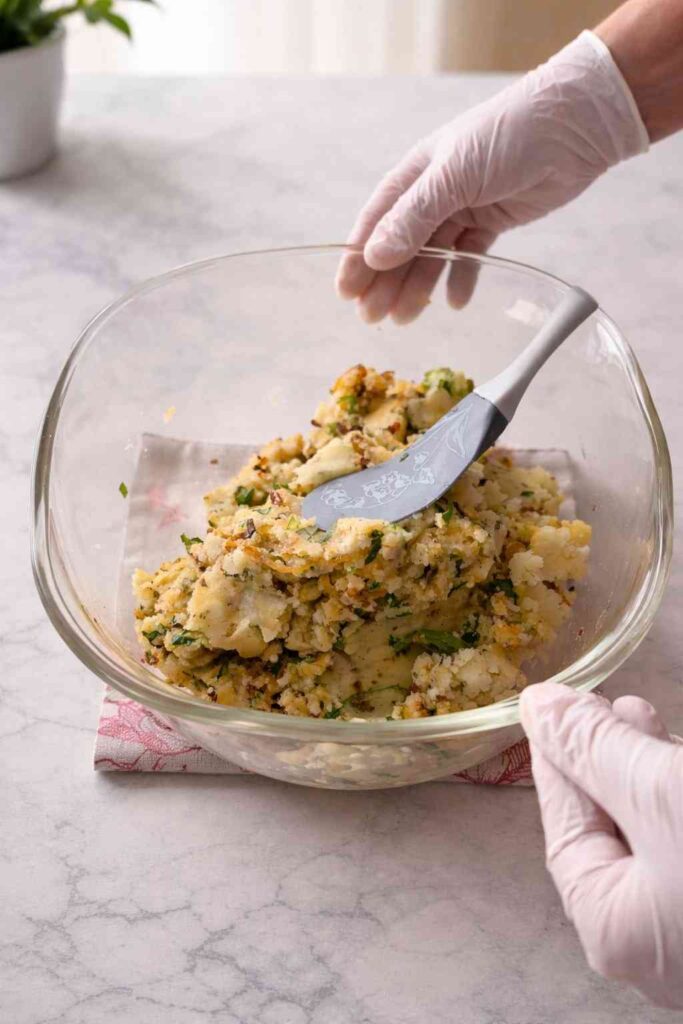 2. Mash & Mix: In a large bowl, combine your mashed potatoes with the sautéed onion mixture. Fold in the black pepper, Italian herbs, salt, fresh coriander, green chilies, and lemon juice. Mix until the spices are evenly distributed.