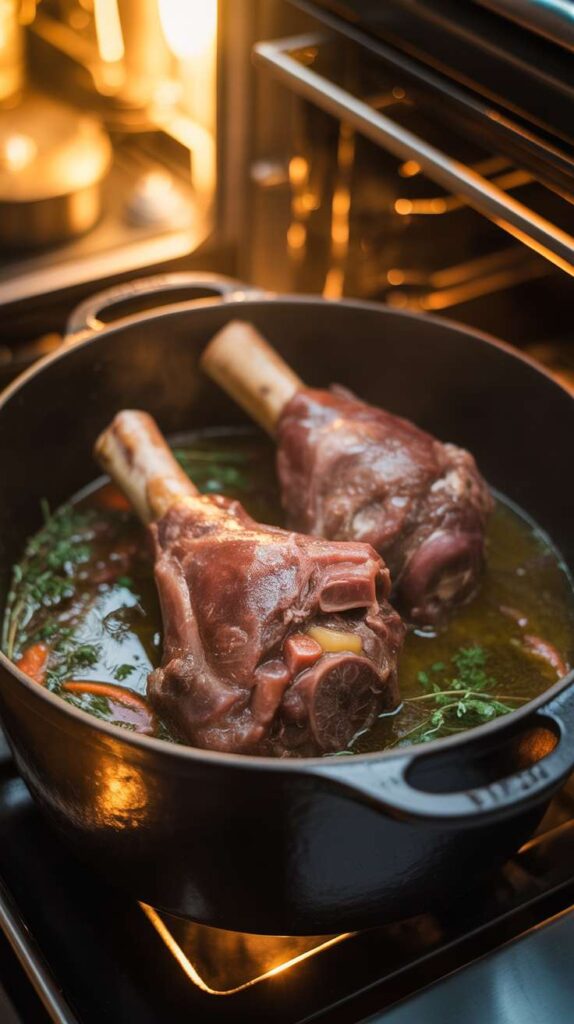 - BraiseReturn shanks to the pot, cover, and cook at 150°C for 3.5–4 hours.Low and slow breaks down collagen.