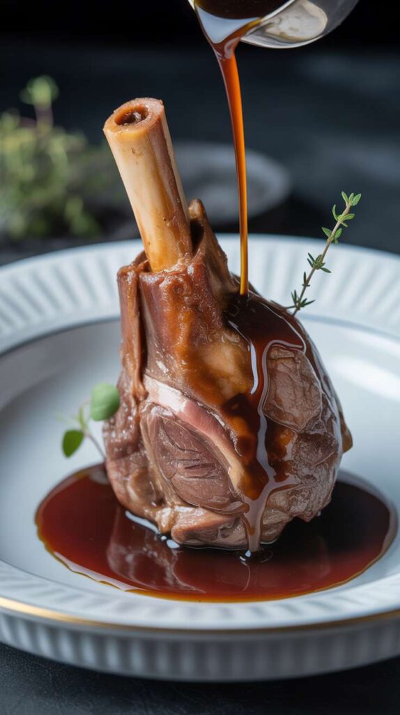 Plate and serve. Stand each shank upright in a shallow bowl. Pour the hot, reduced jus directly over the top so it glistens and pools around the base. Serve immediately while everything is steaming and the jus is at its glossiest.