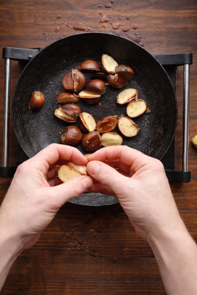 Score an “X” through shell + inner skin on the flat side of each chestnut (safety + easier peeling).