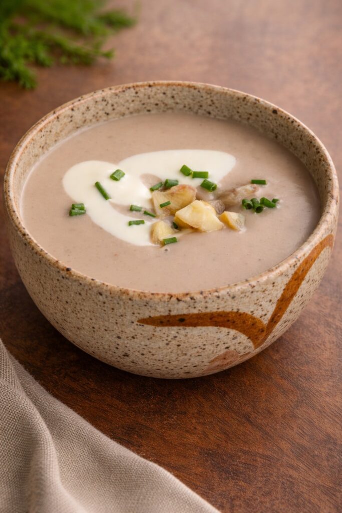 Return the smooth pureed soup to gentle heat. Stir in the heavy cream, beginning with ½ cup and increasing to up to 1 cup depending on your preferred consistency — more cream produces a thinner, silkier soup, while ½ cup maintains a thicker, more intensely chestnut-forward body. Add the tablespoon of maple syrup, which does not make the soup taste sweet in any confectionery sense, but rather enhances the chestnut’s own natural sweetness in a way that makes it seem more fully realized. Grate in a careful pinch of fresh nutmeg — this is a finishing spice, present as an accent rather than a flavor, and should register as warmth and complexity rather than as a distinct or identifiable nutmeg note. Season carefully with salt and black pepper, tasting repeatedly and adjusting in small increments. As the source material wisely notes, the difference between a good bowl of chestnut soup and a great one lives entirely in the precision of this final seasoning moment. Ladle into warmed bowls and garnish with a elegant swirl of cream, a small mound of deeply caramelized onions, or a scattering of sautéed porcini mushrooms.
