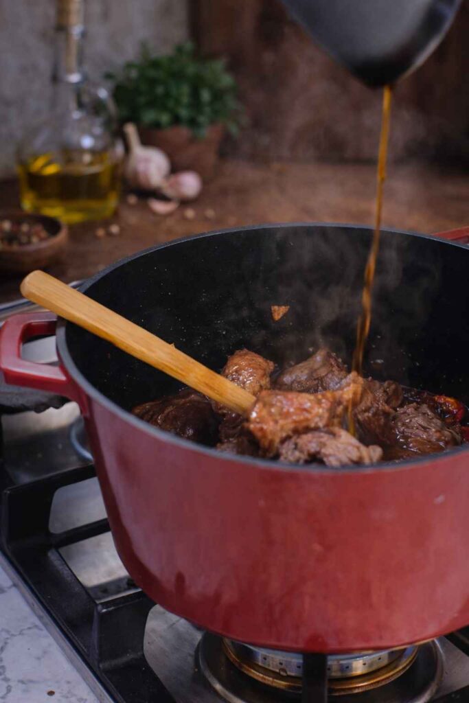 Now for one of the most satisfying moments in cooking: return to your lamb searing pan and pour the red wine directly into it over medium heat. Using a wooden spoon, scrape up every last brown, caramelized bit adhered to the pan bottom — this is the fond, and it is pure concentrated flavor. Pour the wine and all its dissolved goodness into the vegetable pot, then transfer the seared lamb pieces in on top. The combination of the deglazed fond with the tomato paste and vegetables is what gives the Yiouvetsi sauce its remarkable, layered depth.