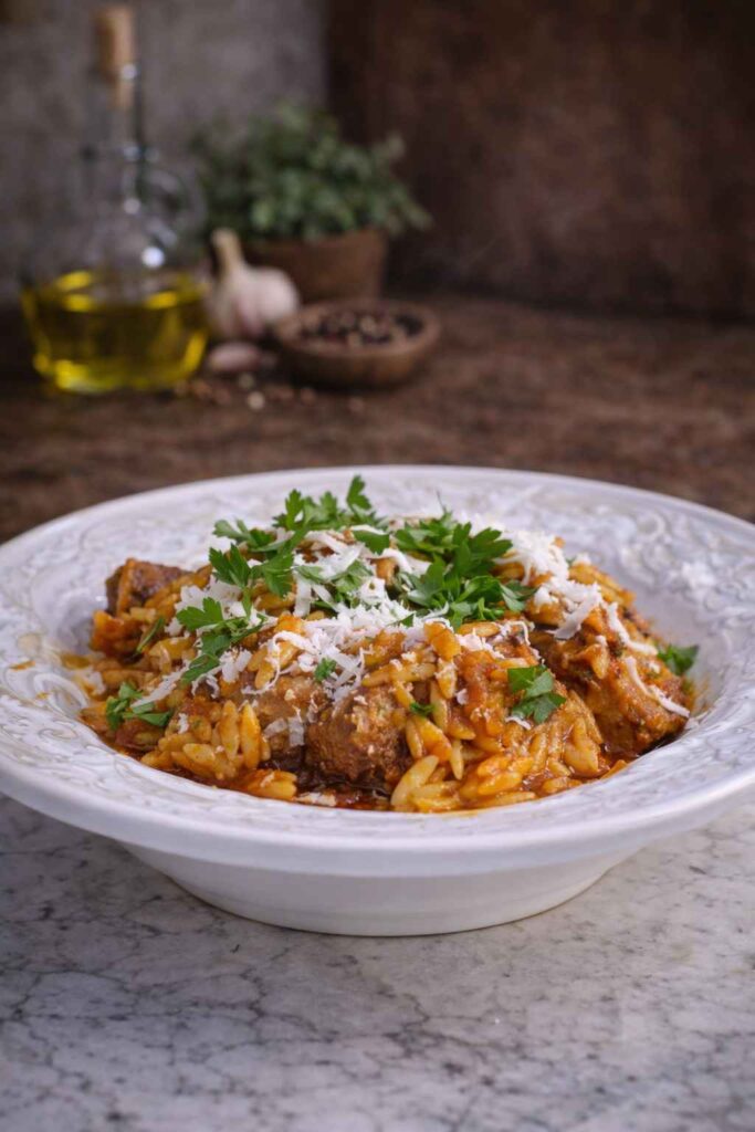 The dish is built around two central components: lamb (arni) and orzo (kritharaki). Orzo is a small, rice-shaped pasta that is used extensively in Greek cooking, and its unique shape makes it particularly well-suited for absorbing liquid during baking. As the orzo cooks in the oven alongside the braised lamb, it soaks up the tomato sauce, the rendered lamb fat, and the aromatic pan juices, swelling and becoming dense with flavor. This is why Yiouvetsi is so frequently compared to a risotto — the orzo achieves a similarly creamy, almost flowing texture that is deeply satisfying.