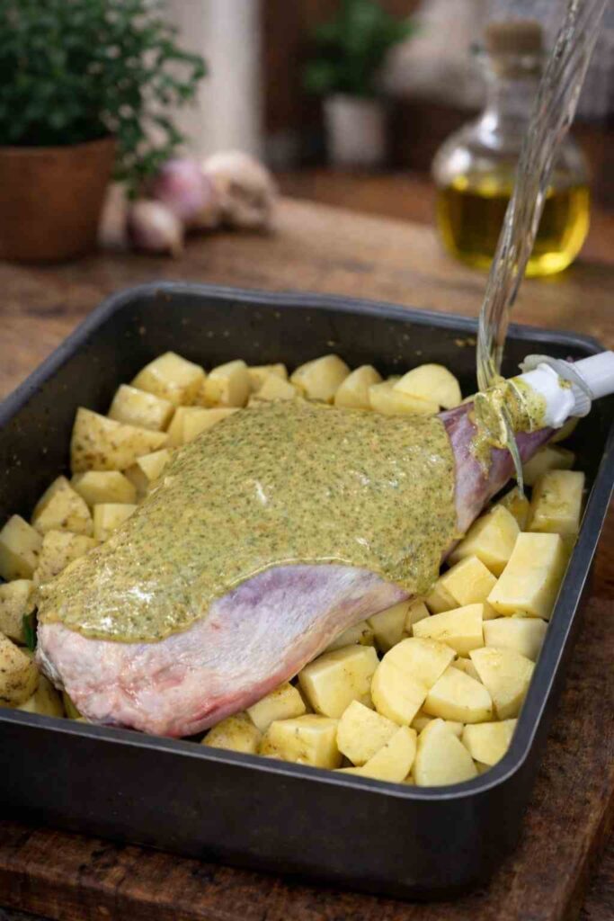 Do not skip the bone. A bone-in leg of lamb is specifically called for and strongly recommended. The bone conducts heat into the centre of the joint during cooking and, more importantly, releases collagen and marrow that add incredible depth of flavour to the pan juices and the potatoes.