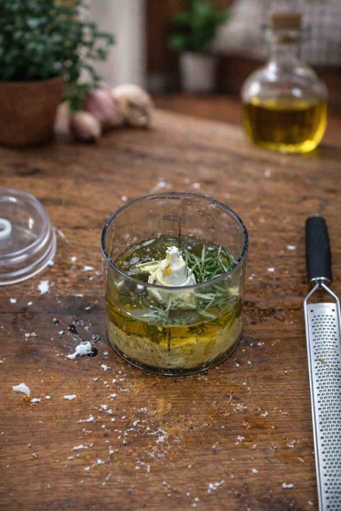 This is where the recipe becomes truly exceptional. Place the olive oil, lemon juice, lemon zest, honey, mustard, minced garlic, dried oregano, fresh rosemary, and crumbled stock cube into a blender or small food processor. Season generously with salt and freshly ground black pepper. Blend everything together for 30–60 seconds until the mixture is fully emulsified and you have a smooth, glossy, intensely aromatic marinade.