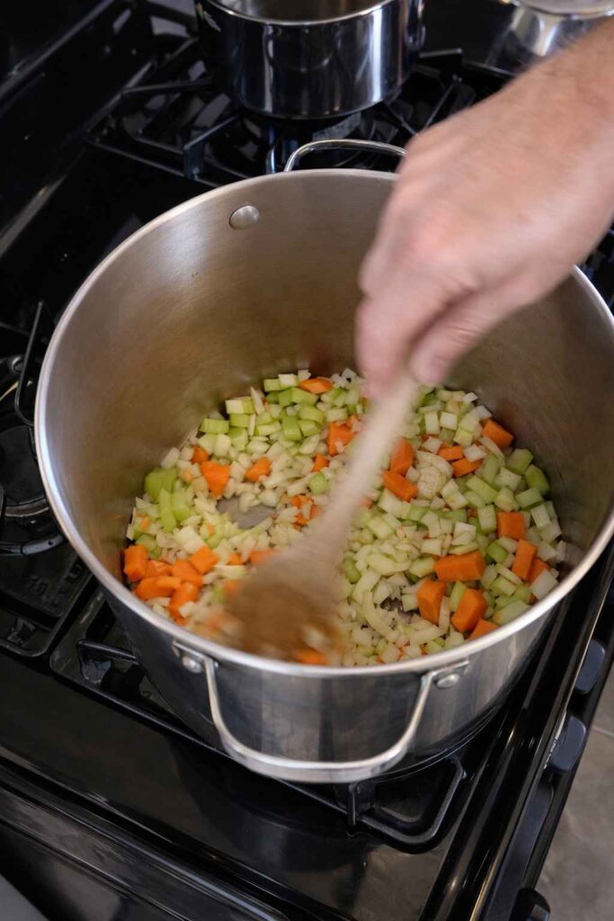Over medium heat, heat the olive oil and butter together in your biggest stockpot. The two fats work together on purpose: the butter adds its rich flavor and texture, and the olive oil raises the smoke point of the mixture, which keeps the butter’s milk solids from burning before the vegetables are fully cooked. Mix in the chopped carrots, onion, and celery with the hot fat. Cook for 5 to 7 minutes, stirring every so often, until the onion pieces are completely soft and see-through. You want it to be sweet and soft, not brown. Add the minced garlic and cook for one more minute, stirring constantly, until the garlic smells good. Take it off the heat right away. Garlic burns quickly, and burned garlic adds a bitter, acrid flavor that will last for the soup’s entire three-hour cooking time.