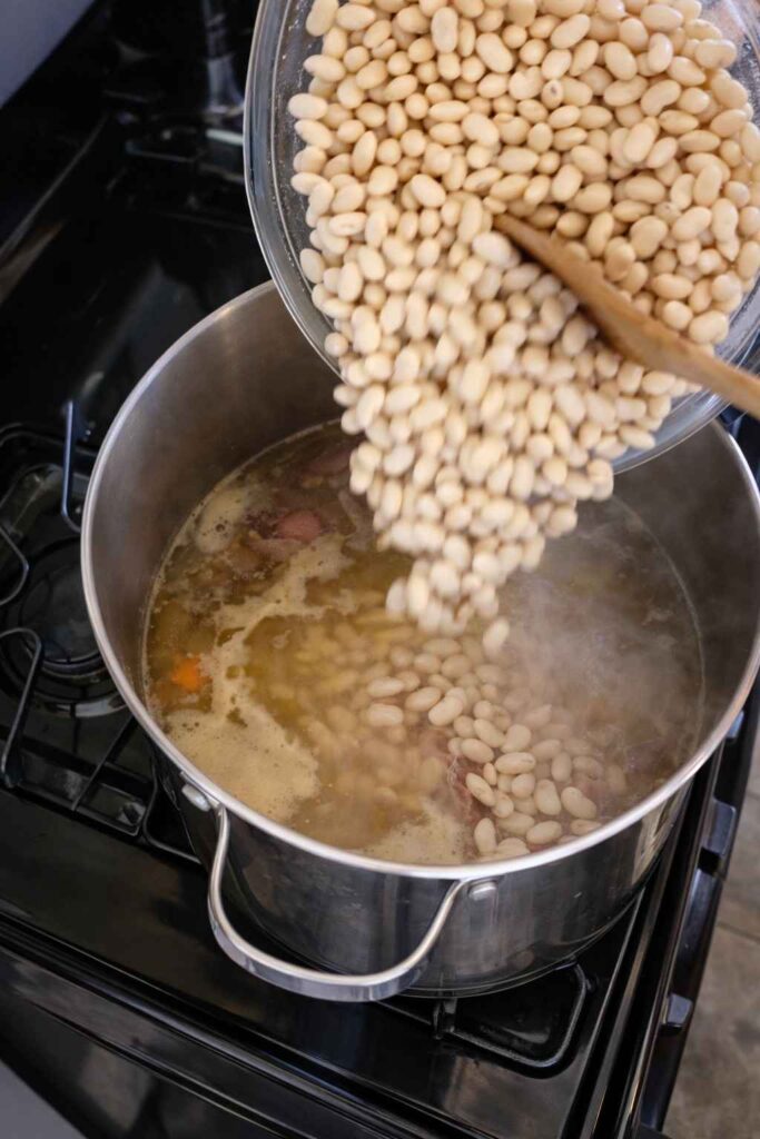 Start by rinsing the dry Great Northern beans very well under cold running water. Pick out any beans that are shriveled or discolored, as well as any other debris. Put a different pot of water on the stove and bring it to a full, rolling boil. Add the beans that have been rinsed, turn off the heat right away, cover the pot with a lid that fits tightly, and let the beans soak for an hour without being disturbed. This “quick soak” method is a planned technical shortcut. It uses residual heat to start hydrating the beans’ outer skin without cooking the inside. This makes sure that they will evenly absorb the ham broth and cook to a perfectly creamy consistency during the long simmer instead of staying hard in the middle.