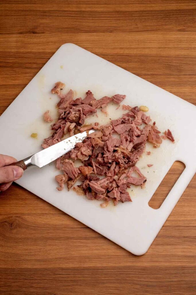 Take the ham hocks and bay leaves out of the pot with tongs or a big slotted spoon and throw them away. They are done. The broth has taken in all of the flavor, collagen, and smokiness from the meat over the past three hours. Take the ham bone out carefully and put it on a cutting board. Let it cool for 5 to 10 minutes, or until it is safe to touch. Then, use two forks or your hands to pull all the meat off the bone. Cut up any big pieces into smaller ones that are good for soup, and then put all of the shredded ham back in the pot. Stir the meat into the beans and broth so that it is evenly spread out.